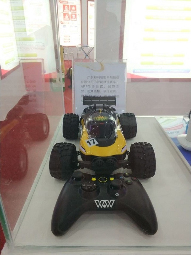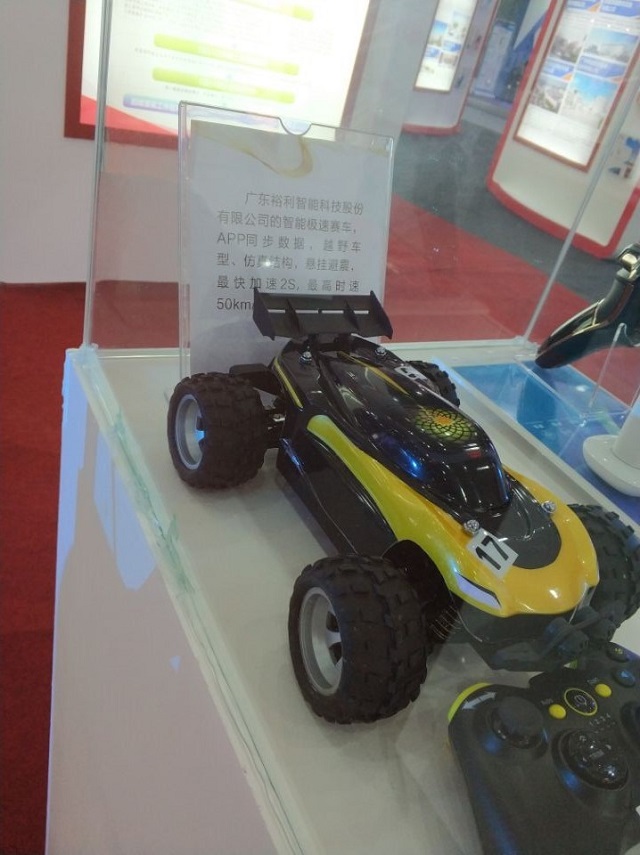 此次公司所展示的遥控赛车,是全球第一款内置智能芯片和传感器的极速赛车,它可以实时测试赛车的速度、里程,还加上了GPS定位,并可以保存下来,当然和手机同步数据这样的简单功能更不在话下。这款赛车时速高达50公里。因赛车的高速性能以及室外各种场地的特点,采用了越野赛车车型,1:18的仿真设计,以实现真车的操控体验。同时采用四轮驱动以及空气真胎设计,保证赛车良好的抓地性。另外采用高弹地盘,悬挂避震,以保证内部元器件安全。另外采用PVC防撞车身以及防撞鼻翼设计,保证了赛车的安全性。